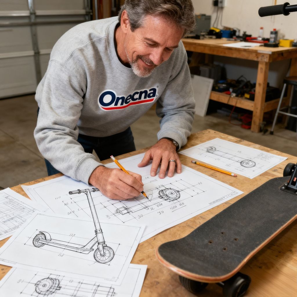 38-year-old American engineer Mark Hansen spotted a market gap while cycling with his daughter—most products were clunky e-bikes or underpowered single-motor scooters. A new energy motor expert, he vowed to build an affordable, fast, high-power, and stylish dual-motor scooter, drafting the first design in his garage in a "ONECNA"-logo hoodie.